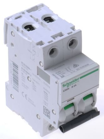 Schneider Electric Acti9 i60N MCBs 2 PoleActi 9 iC60N series multi-standard circuit breakers combine circuit protection against short circuit currents and circuit protection against overload currents it also protects people against indirect contact with TN and IT neutral systems. Fully compliant with standards IEC/EN 60898 and IEC/EN 60947-2. ACTi 9 is fully tested, approved and certified by national and international third parties. It guarantees that your installation is safe and compliant with all relevant safety standards which demonstrates to your customers that you use industry-approved materials and best practices. These MCBs are normally used for high inductive loads where switching surges are high. Providing essential protection in industrial and commercial buildings, these miniature circuit breakers work especially well in polluted environments and networks.VisiSafe guarantees the downstream circuit is always safe regardless of overvoltage conditions, even in the most demanding environments; the green strip indicates the safe position of contacts.VisiTrip red window on the front face indicates fault tripping allowing fast diagnosis, resolution, and reclosing loads for easier building management and reduced downtimeBenefits and FeaturesDownstream circuit is always safe Class insulation ensures continuous protection for both operators and unqualified persons. Insulated terminals (IP20) Highly durable with robust connections that provide twice the standard tighteningProvide greater continuity of service thanks to VisiTrip. Double clip dismounting with comb busbar in placeStandardsIEC 60898 – Relates to Low Voltage Circuit Breakers for use in household and similarInstallations. In the UK traditionally known as miniature circuit breakers (MCB’s).IEC 60947-2 Relates to Low Voltage Circuit Breakers for use in industrial and similarInstallations. In the UK traditionally known as moulded case circuit breakers (MCCB’s) and also air circuit breakers (ACB’s).