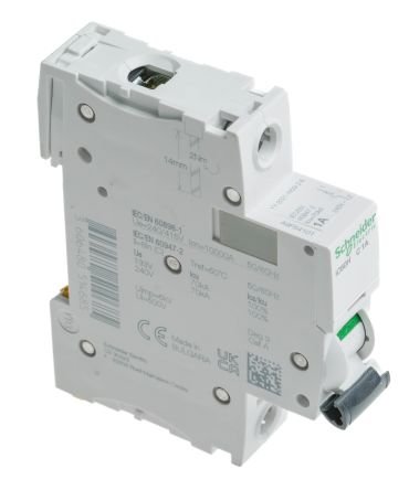 benefits:Easy to install these consumer units, single clip on to Din Rail, compact in nature making wiring easier and simplifying your circuit system. Ergonomically designed with robust connections. IP20B terminal shutters.Schneider ‘VisiSafe’ for safer operation and maintenance work on electrical circuits. Absolute safety of circuit protection guaranteed.Schneider ‘VisiTrip’ for easier fault detection in the MCB outgoers. This can help reduce intervention time greatly, protecting the device before any further electrical problems occur.1P (number of protected poles).Nominal currents ranging from 1 to 63 Amps.Full compatibility with Acti 9 RCDs and MCCBs.Operating voltage up to 440 V ac, insulation voltage 500 V.Additional add-on earth leakage protection devices are available. This offers you better continuity of service.Schneider Green Premium classed product.Protection ratings & Safety features (See datasheet for further details) – IP20 conforming to IEC 60529. Protection against solid objects up to 12mm e.g. fingers, small tools.Pollution degree level of 3 conforming to EN/IEC 60947-2. EN/IEC 60947-2 & EN/IEC 60898-1.Operating temperature (for operation) -35 to 70 ° C.Padlockable, providing extra protection.Applications.DC current circuit protection / Motor circuit protection.Polluted environments/networks.Any circuit types within industrial/commercial buildings.Q&