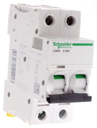 Electric Acti Schneider 9 iC60H MCB, 2P, 63A Curve C, 440V AC, 100 → 133V DC, 10 kA Breaking Capacity – A9F54263
