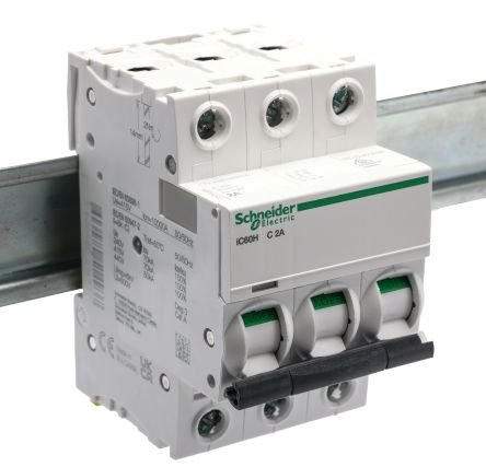 A9F54302 – Schneider Electric Acti 9 iC60H MCB, 3P, 2A Curve C, 440V AC, 100 → 133V DC, 10 kA Breaking Capacity