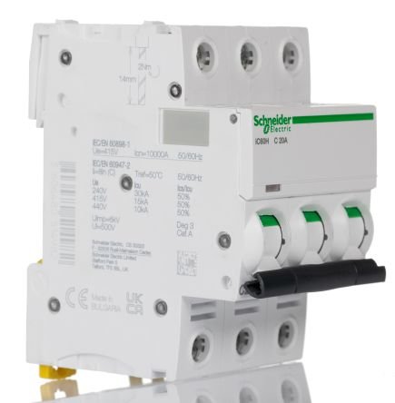 Breaking Capacity Schneider Electric Acti 9 iC60H MCB, 3P, 20A Curve C, 440V AC, 100 → 133V DC, 10 kA A9F54320