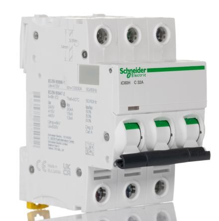 A9F54332 – Schneider Electric Acti 9 iC60H MCB, 3P, 32A Curve C, 440V AC, 100 → 133V DC, 10 kA Breaking Capacity
