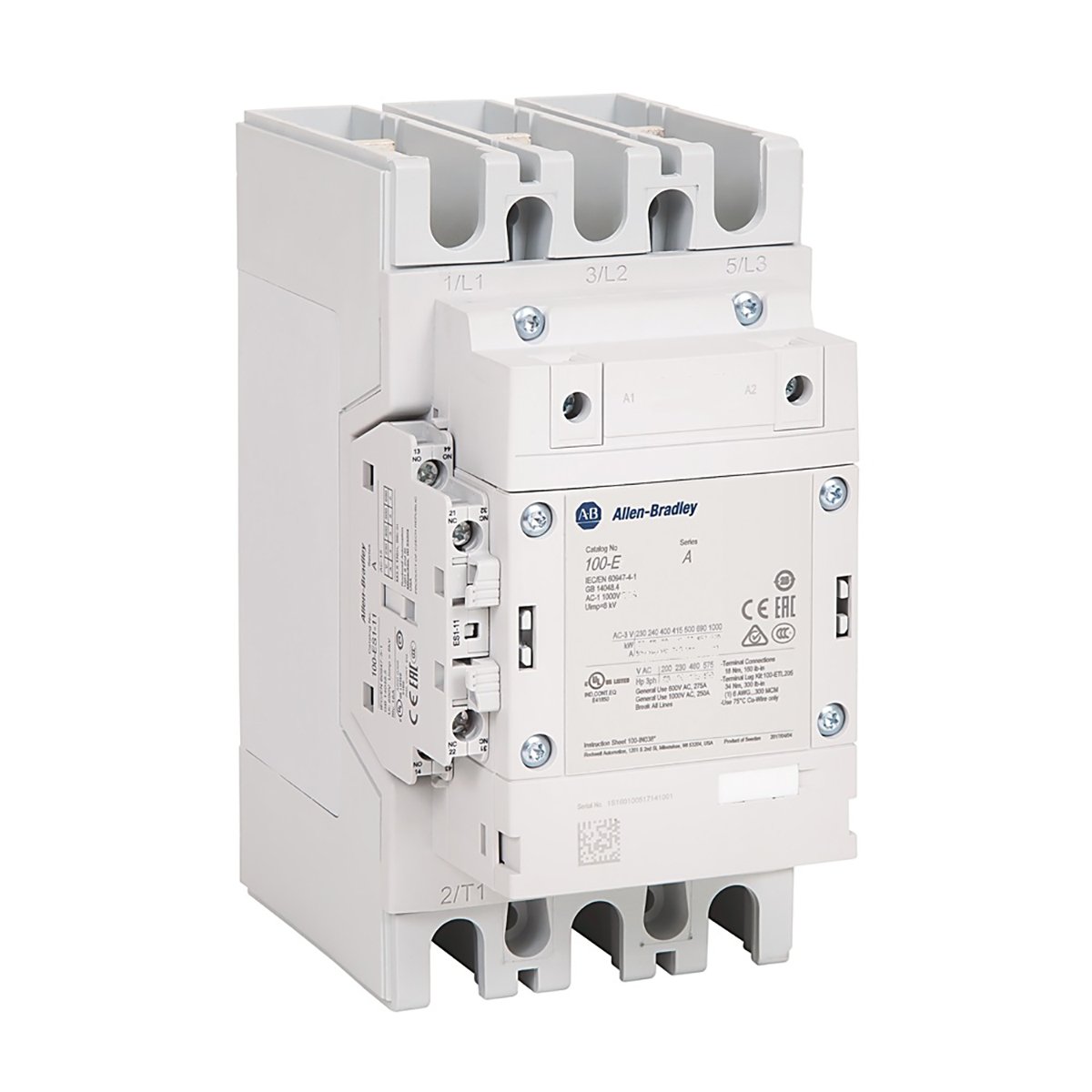 100S-E MCS-E Safety Contactor, 205A, AC3 duty, 100-250V 50/60Hz / 100-250V DC Electronic Coil, 1 N.O. 1 N.C. Standard & 0 N.O. 1 N.C. Lower Power Auxiliary Contacts