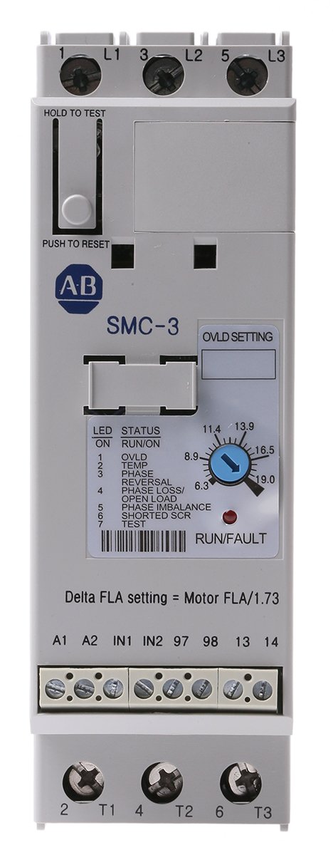 The SMC-3 solid-state soft starter by Allen Bradley is low voltage, compact, and cost-effective Smart Motor Controller that features true three phase control, for superior speed control and a smoother, safer motor start-up and stop. The SMC-3 includes overload protection, integral bypass, and motor and system diagnostics to provide you with a flexible electrical motor control solution which reduces downtime and improves productivity.