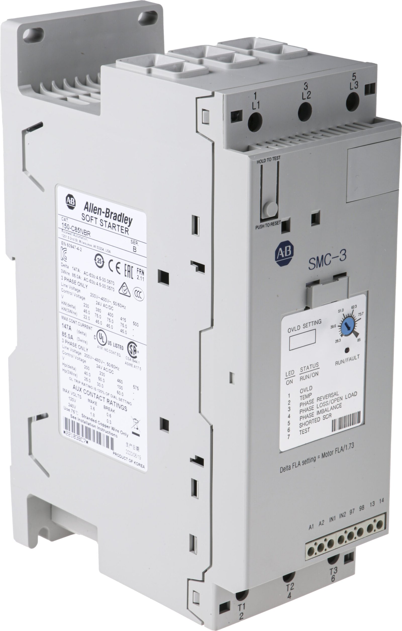 The SMC-3 solid-state soft starter by Allen Bradley is low voltage, compact, and cost-effective Smart Motor Controller that features true three phase control, for superior speed control and a smoother, safer motor start-up and stop. The SMC-3 includes overload protection, integral bypass, and motor and system diagnostics to provide you with a flexible electrical motor control solution which reduces downtime and improves productivity.
