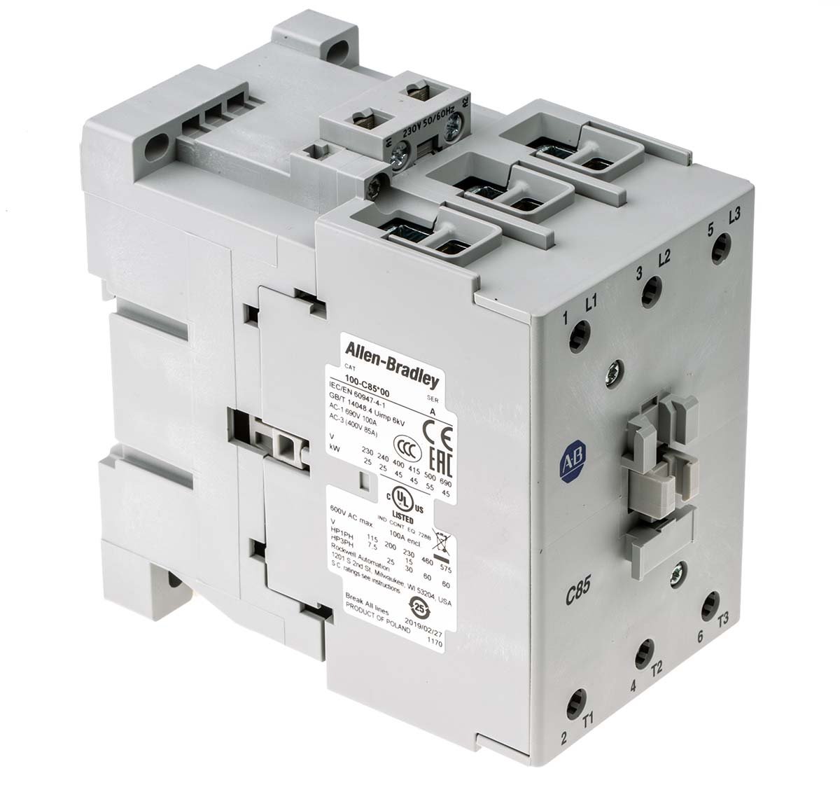 Professional Allen Bradley 100 Series 100C Power Contactor, 230 V ac Coil, 3-Pole, 85 A, 45 kW, 3NO, 690 V ac
