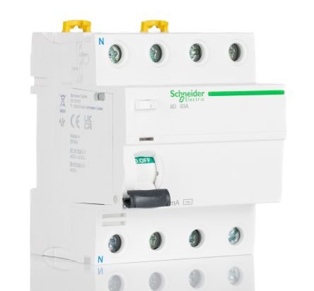 provide:Protection of persons against electric shock by direct contact (≦ 30 mA).Protection of persons against electric shock by indirect contact (≧ 300 mA).Protection of installations against the risk of fire (300 mA or 500 mA).Increased immunity from electrical interference and polluted or corrosive environments.Schneider Electric RCCB, DIN Mounting, 415V AC Rated – Acti 9 Series – A9R41463Make sure it’s only your circuits that break with this RCCB from Schneider Electric. It’s designed to trip a circuit when a fault occurs, protecting staff from electric shocks and downstream equipment from damage. A toggle switch on the front lets you quickly reset your circuit when the error has been sorted. This RCCB has a trip sensitivity of 30mA, so it protects against harmful current levels while preventing nuisance trips that can cause downtime. Its four-pole configuration is suitable for use with three-phase power supplies.Features & Benefits